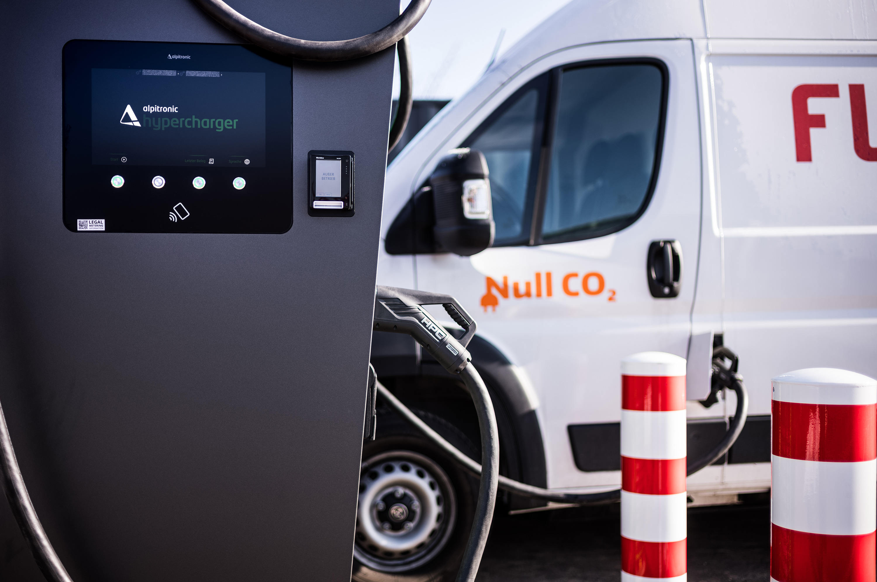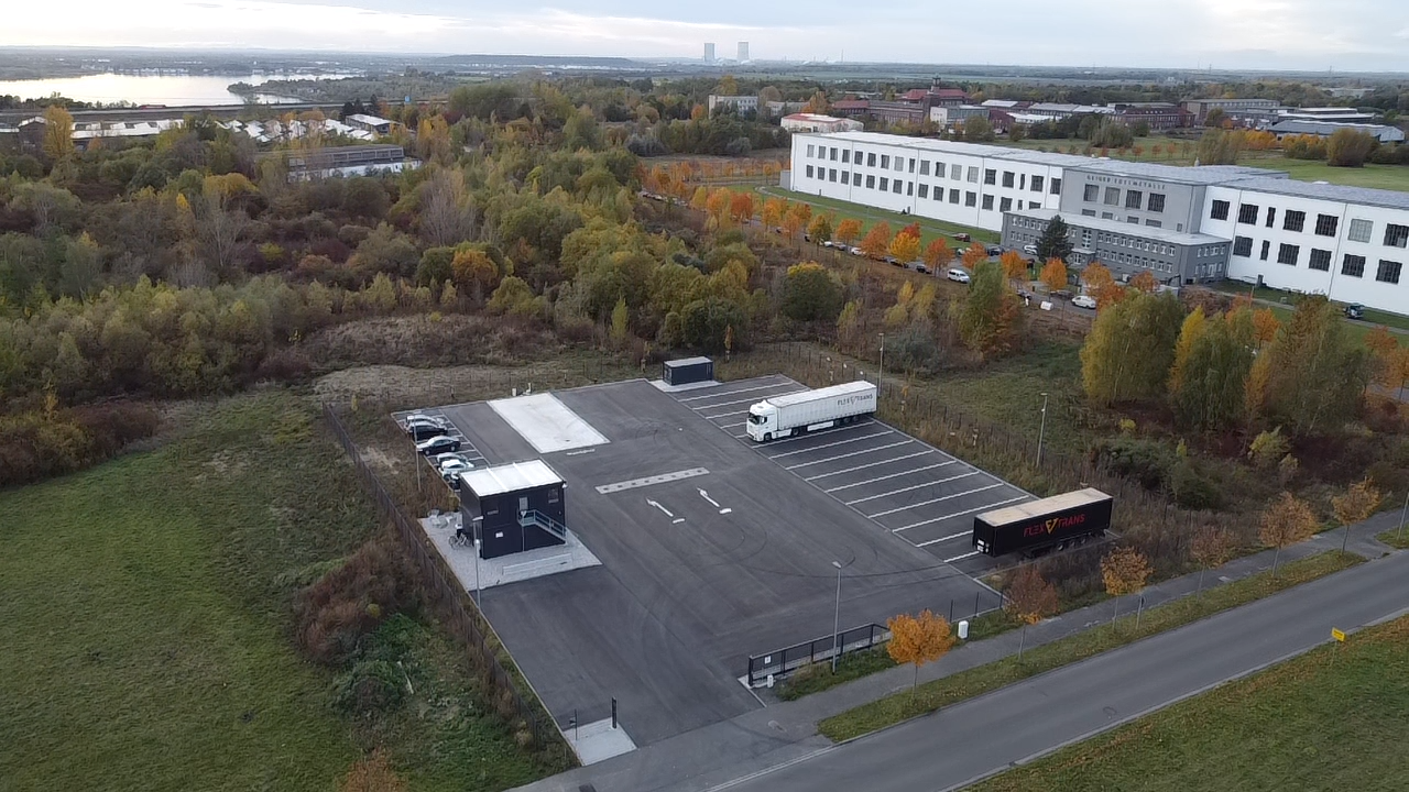 Seit 2025 betreiben wir auf unserem Betriebshof eine eigene Ladeinfrastruktur mit Schnellladesäulen für LKW. Die erste elektrische Sattelzugmaschine sowie ein E-Sprinter sind bereits im Einsatz.
